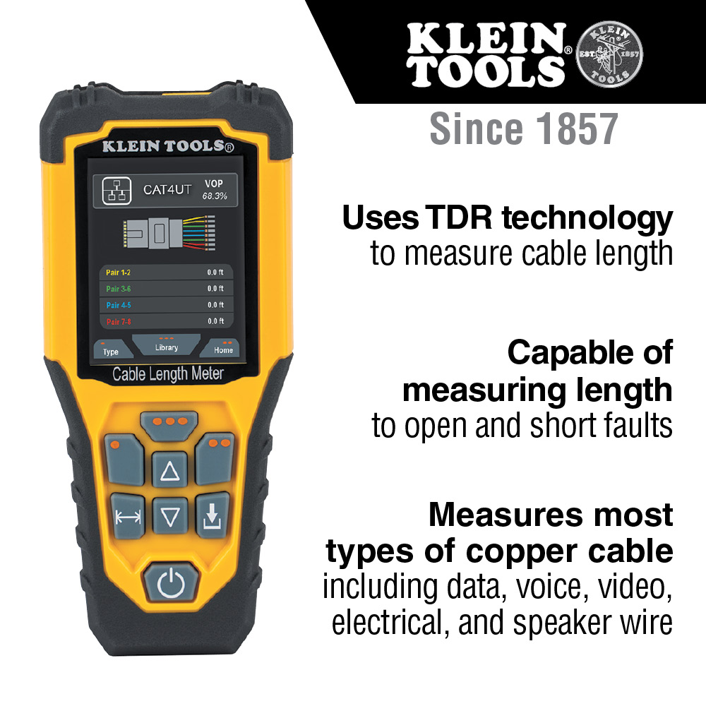 • Programmiert mit Ausbreitungsgeschwindigkeitswerten (VOP) für Koaxial-, Daten-, Romex®- und andere mehradrige Kabel für eine genaue Längenmessung mit einer Genauigkeit von +/- (2 Prozent plus 0,9 m/3 Fuß)